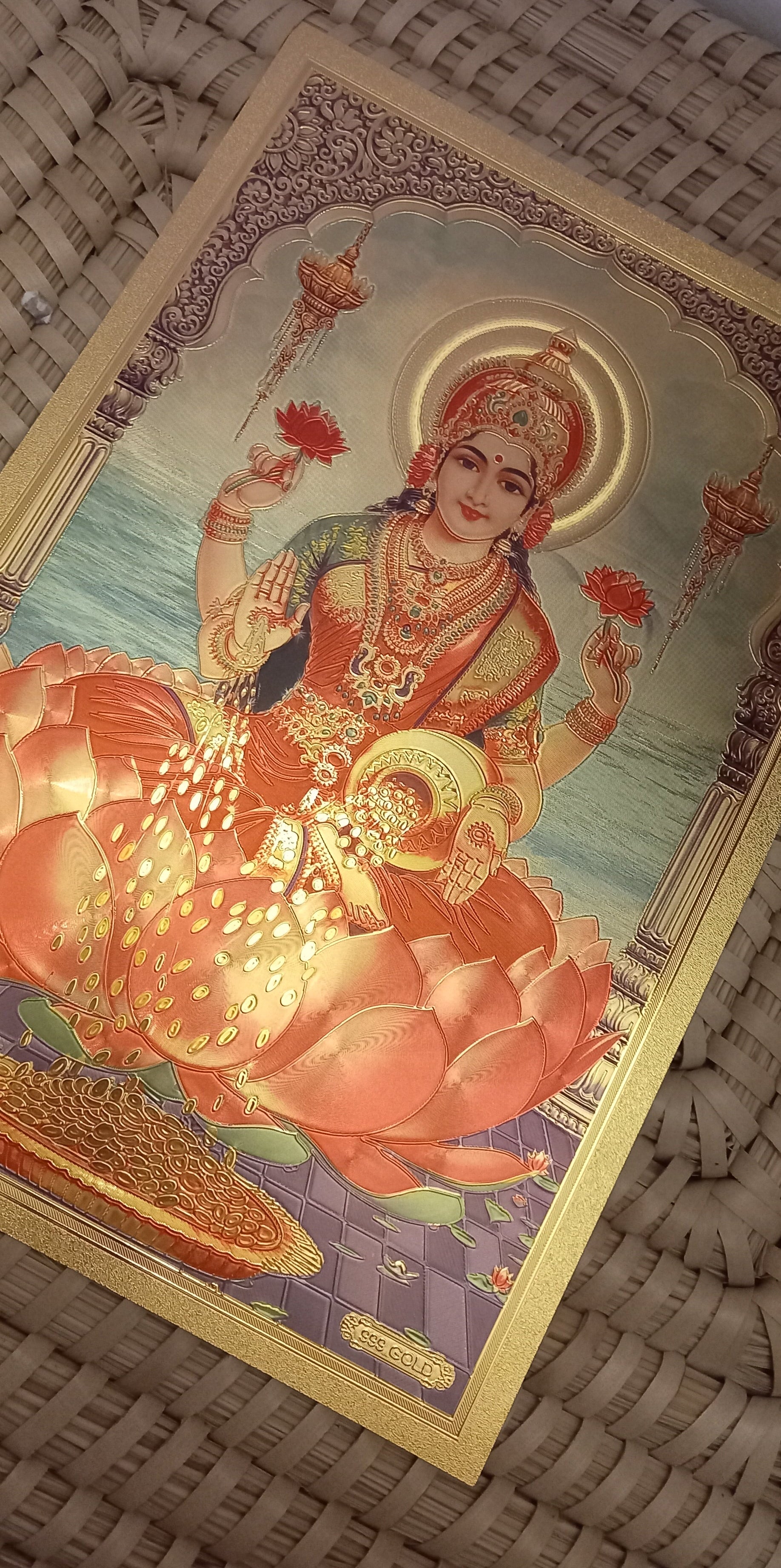 LÁMINA DE LA FORTUNA,LA BELLEZA Y LA ABUNDANCIA 30X20.SEMI-RÍGIDA CON FONDO DORADO FUERZA SIMBÓLICA HINDÚ Y UN ACABADO VISUAL IMPACTANTE.