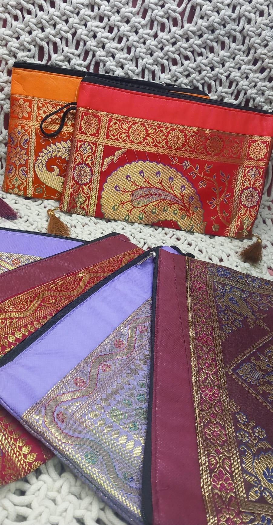 Un accesorio práctico y lleno de historia. Este neceser, confeccionado con telas sedosas de sarees, es una pieza única que combina elegancia y sostenibilidad. Su diseño rectangular y su cierre de cremallera lo hacen ideal para organizar cosméticos, documentos o pequeños objetos con estilo. Cada unidad cuenta con estampados vibrantes y exclusivos, haciendo que cada pieza sea irrepetible y especial.