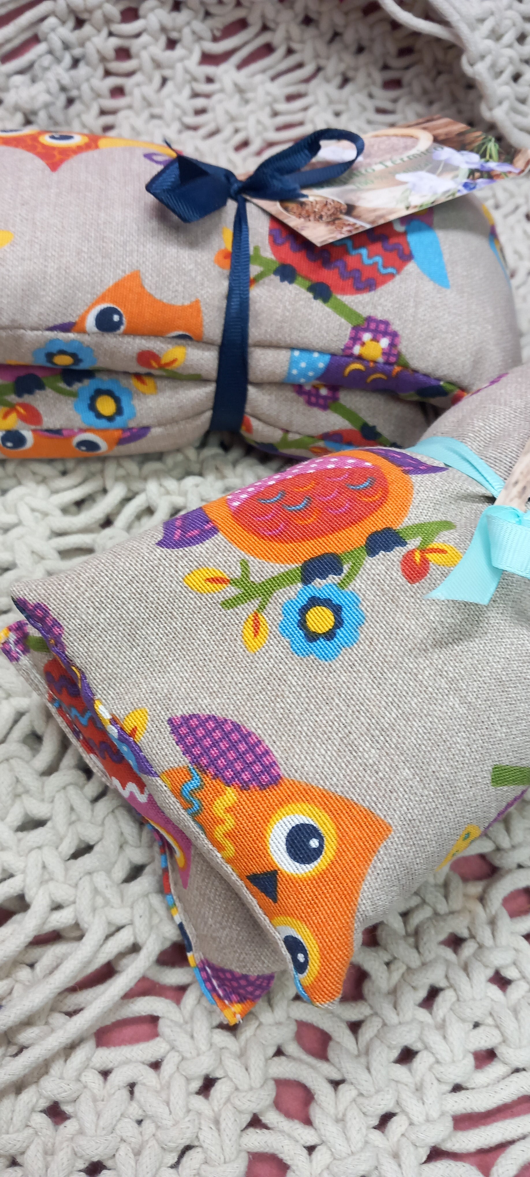Saco térmico terapeútico de búhos en colores sobre fondo de grises.