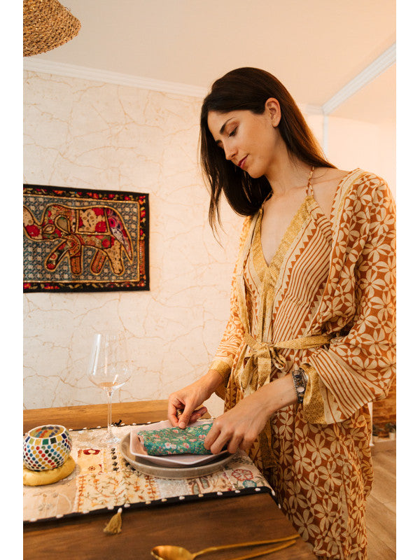 Un clásico del arte textil reinventado con un toque exótico y exclusivo. El tapiz patchwork cuadrado de 90x60 cm está confeccionado artesanalmente con retales bordados en algodón, creando composiciones únicas con flores, formas geométricas y pequeños abalorios brillantes. Cada pieza tiene su propio carácter, con un ribete en tono coordinado que enmarca el diseño y lo convierte en una joya decorativa. Ideal para colgar, usar como camino de mesa o sobre un mueble que quieras destacar.