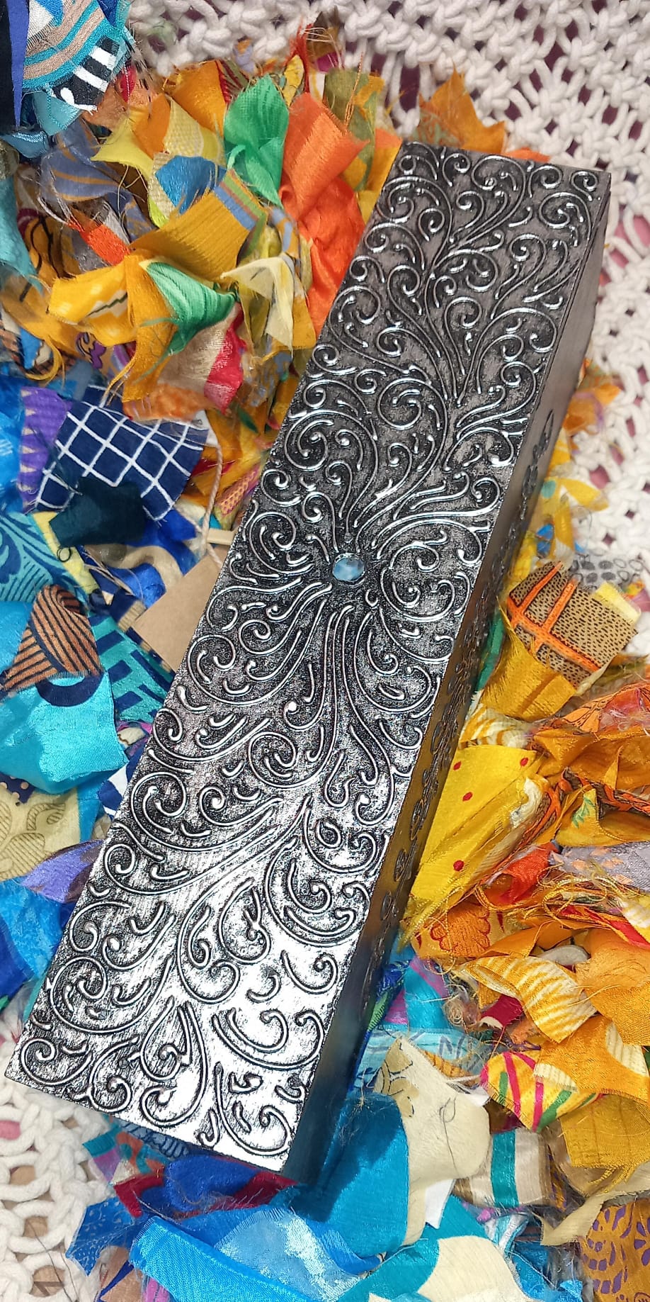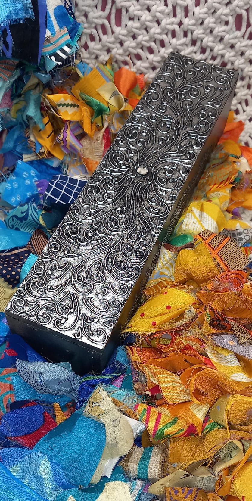 Esta caja de madera artesanalmente tallada y pintada a mano mediante un meticuloso proceso que combina colores vibrantes y cristalitos con símbolos espirituales como la flor de loto que evocan la esencia mística. Su forma de cofre la convierte en un elemento decorativo con carácter, ideal para guardar objetos especiales o dar un toque exótico y exclusivo a cualquier espacio. Cada pieza es única, lo que refuerza su valor artesanal y la hace perfecta para espacios que buscan ofrecer algo realmente distinto y con alma.