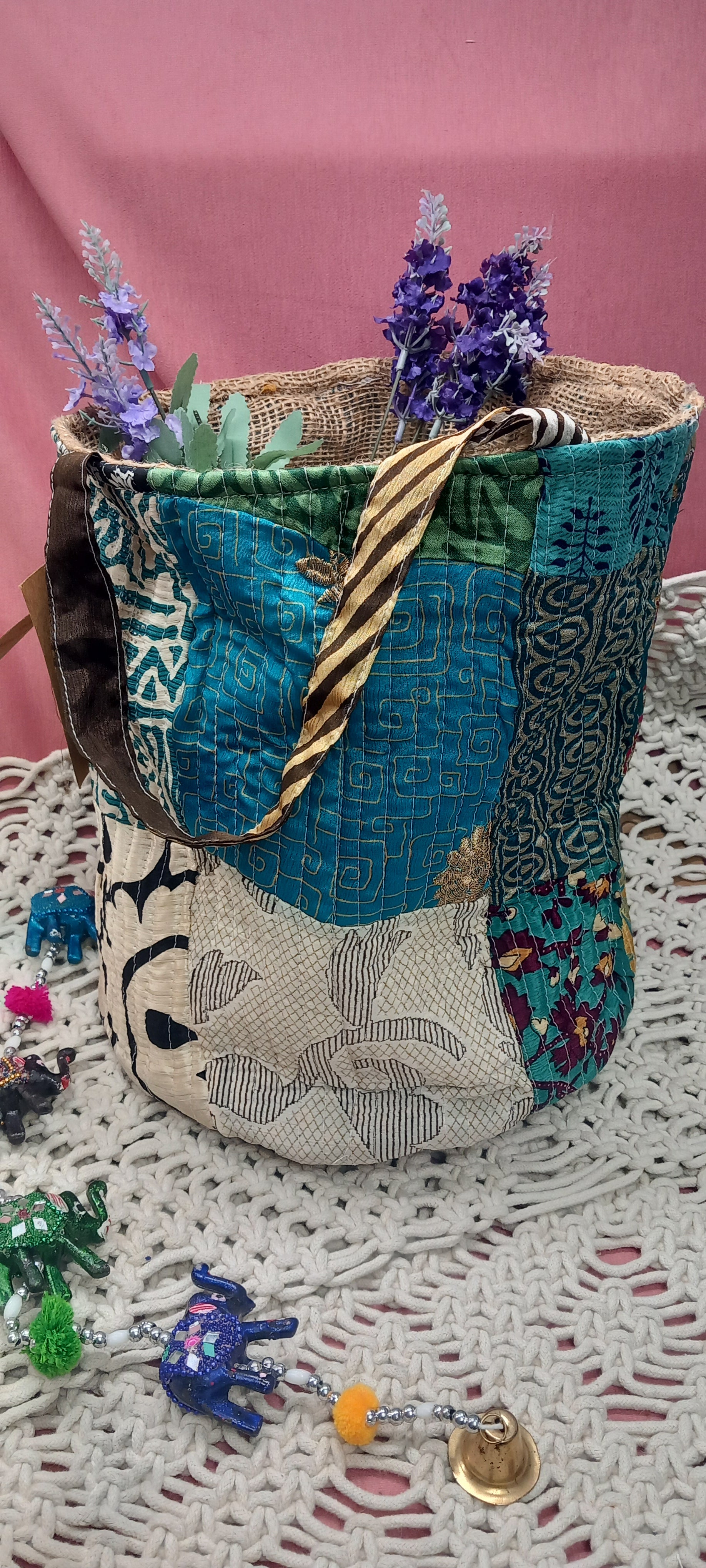 El Cesto Wild Saree es una pieza artesanal única que combina funcionalidad, sostenibilidad y estilo en un diseño versátil. Confeccionado con telas sedosas recicladas de saree y yute, cada cesto es irrepetible gracias a sus vibrantes estampados elaborados con la técnica de patchwork. Con unas medidas de 25x30 cm, es ideal para usarlo como bolso con un toque bohemio o como elemento decorativo en el hogar, aportando color, personalidad y un aire auténtico de artesanía india.