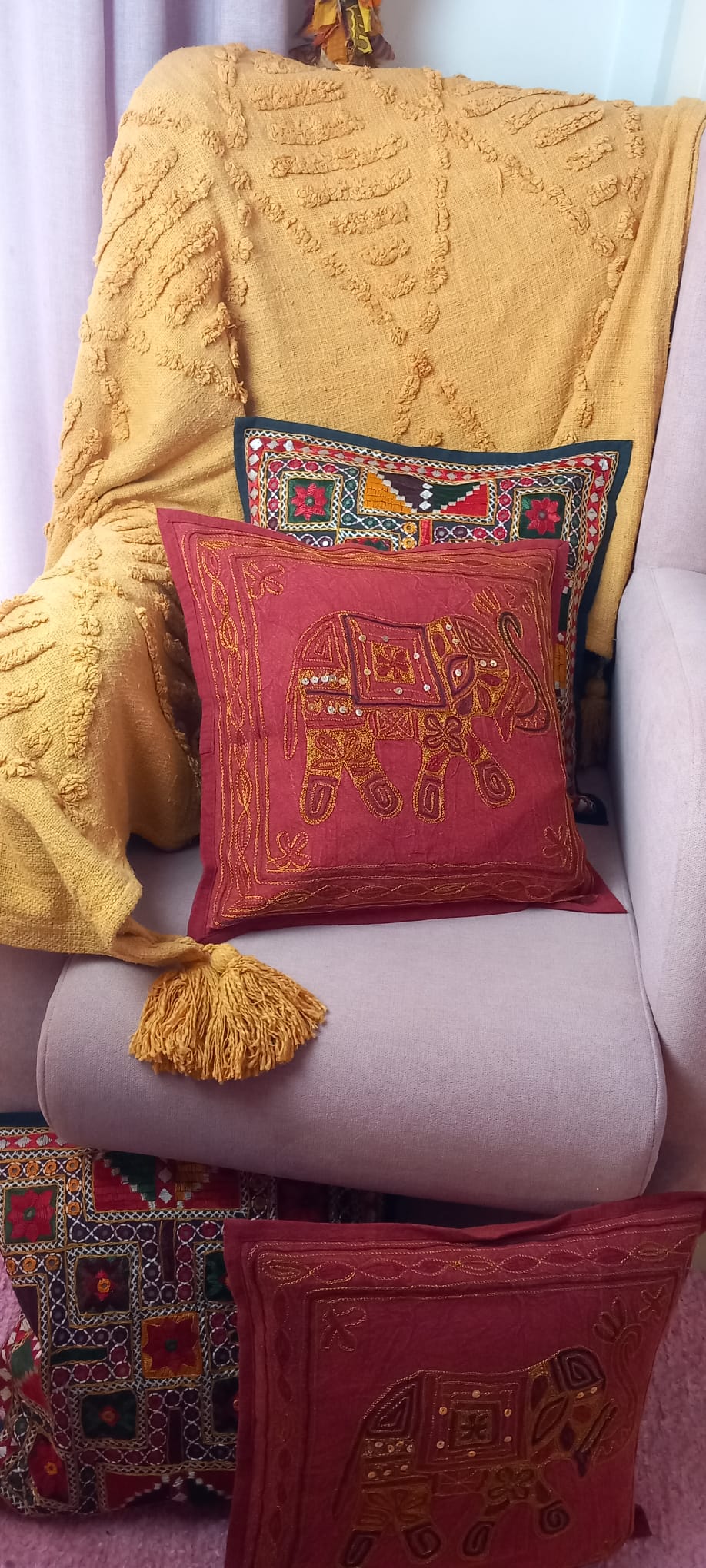 Un toque bohemio y artesanal para cualquier espacio. Esta funda de cojín Old Banjara elefante vino es una pieza única, confeccionada con retales de tejidos tradicionales llenos de historia. Sus vibrantes bordados, detalles en espejos y abalorios la convierten en un complemento perfecto para quienes buscan decorar con personalidad y autenticidad. Su apertura trasera facilita la colocación del relleno, aportando comodidad y practicidad.