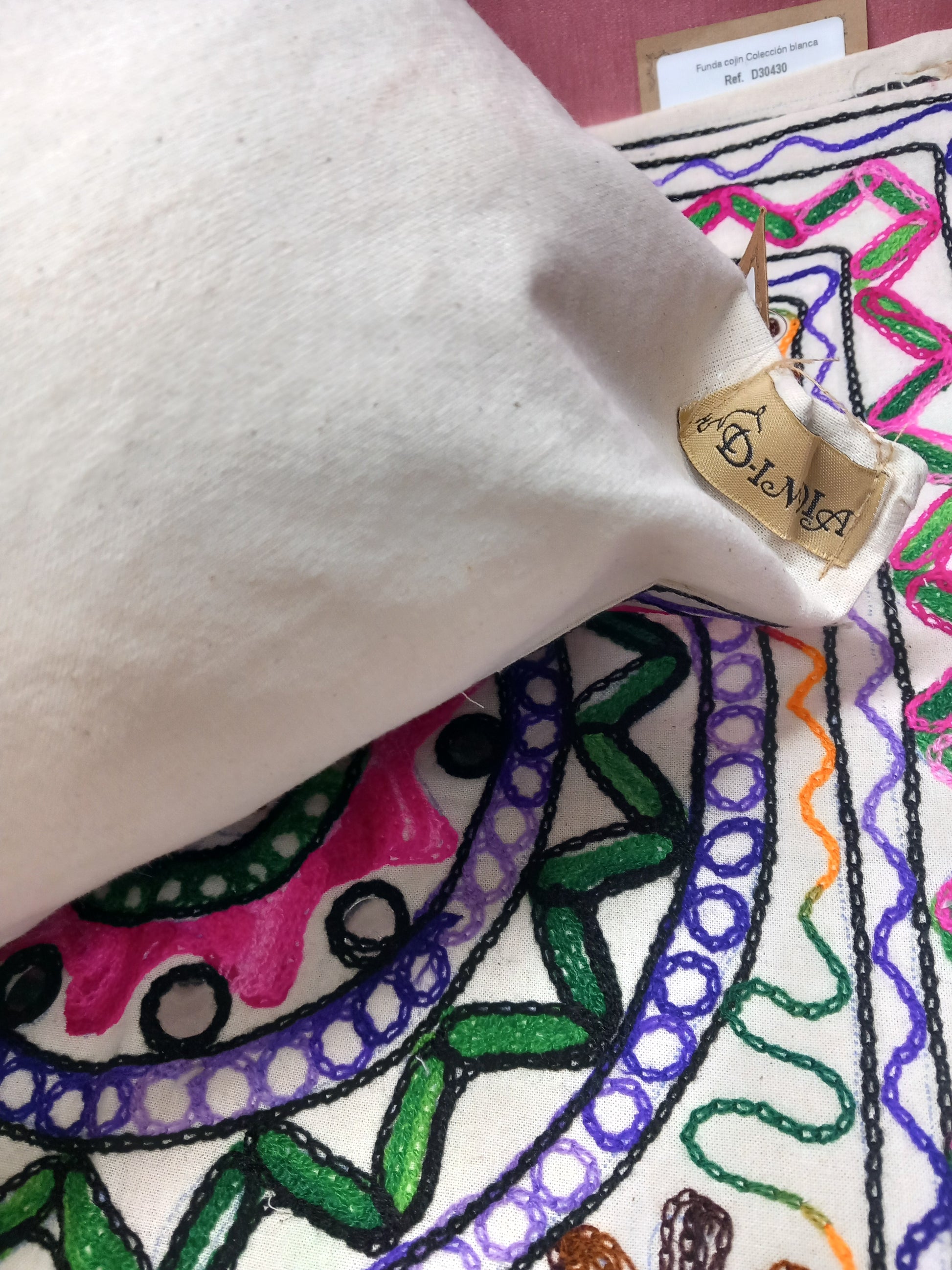 La funda de cojín con fondo blanco es un modelo elaborado en algodón artesanalmente.