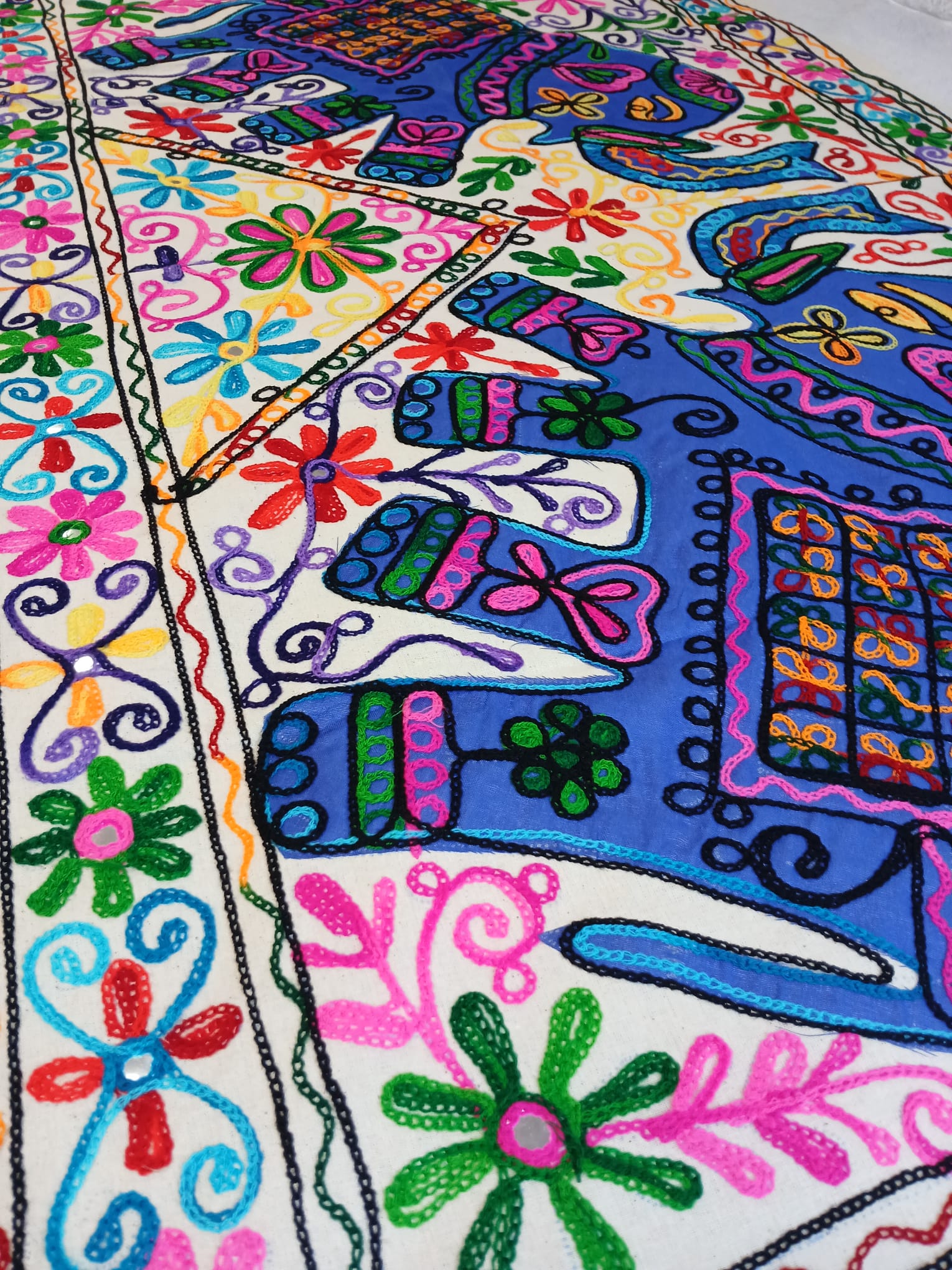 Una pieza artesanal que transmite fuerza, armonía y belleza en cada puntada. El tapiz Gora 90x130 cm con motivo de elefante está elaborado artesanalmente en algodón, bordado con hilos de colores vivos que contrastan con el fondo blanco. Combina flores y la figura del elefante, símbolo de protección y sabiduría, en un diseño rectangular que embellece cualquier espacio. Su borde puede variar, lo que aporta a cada unidad un carácter completamente único.