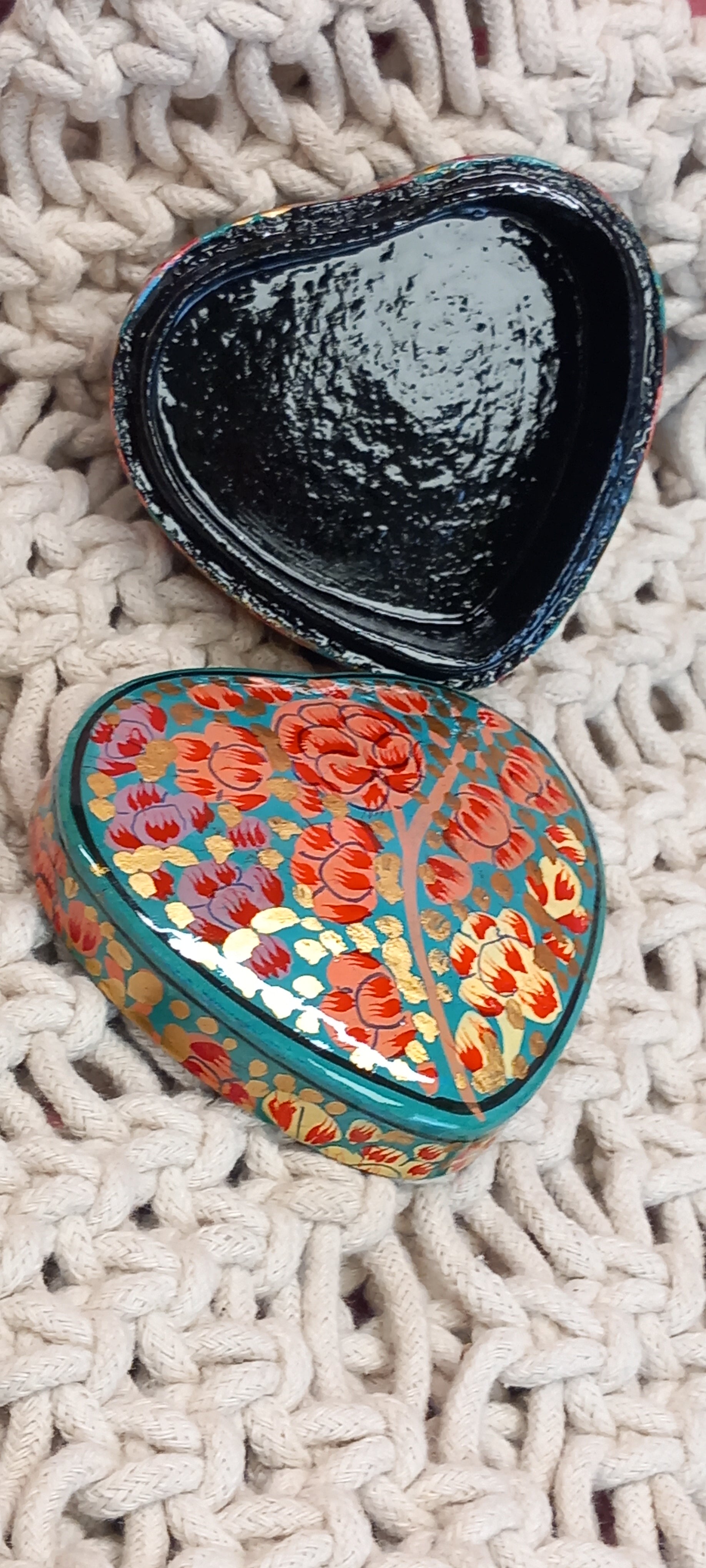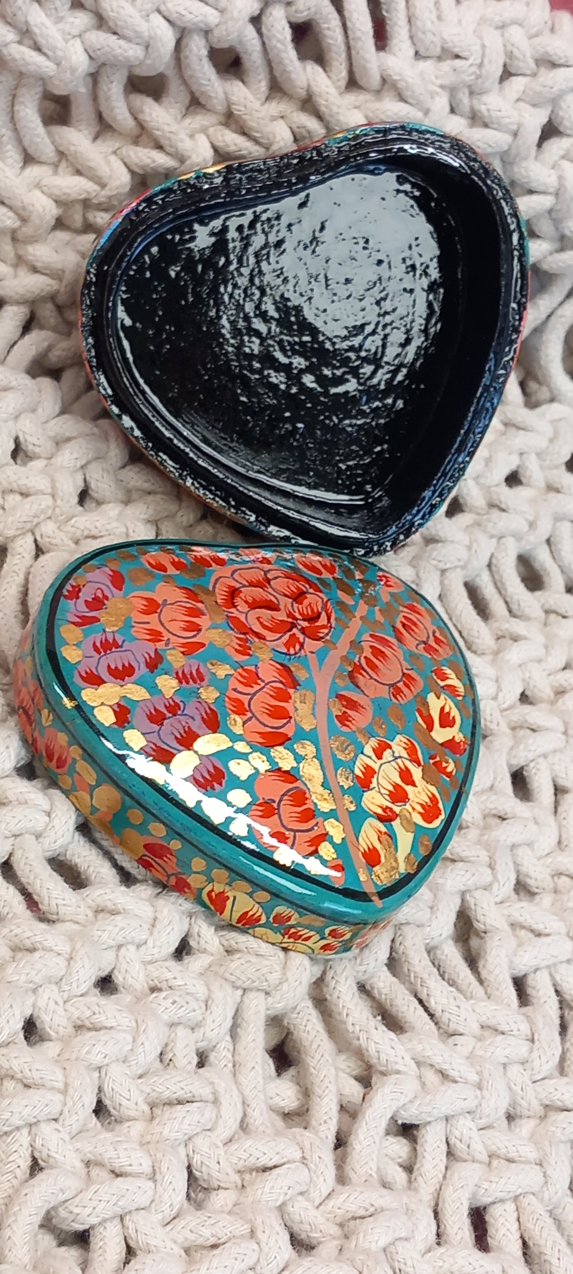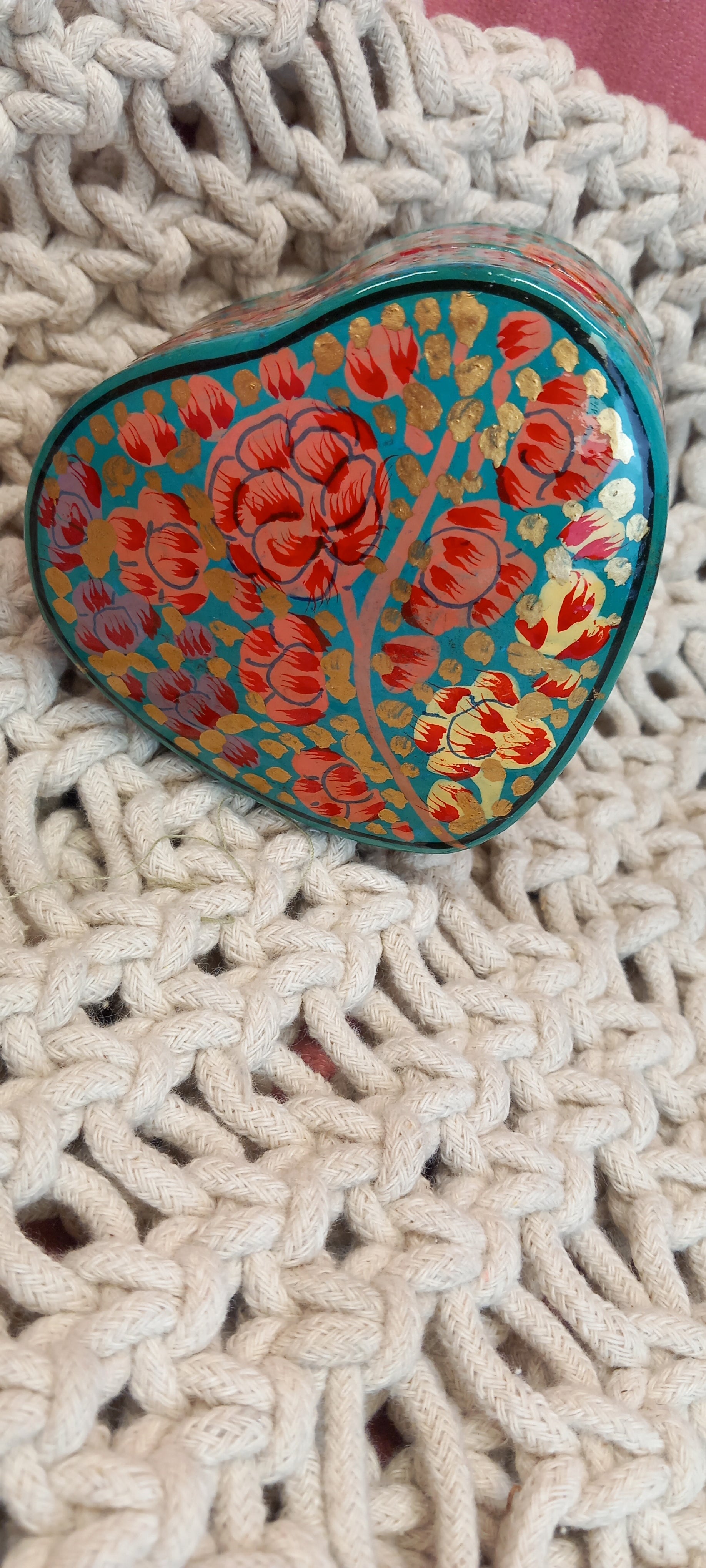 Un detalle artesanal con un encanto especial. La Caja Suruc S es una pieza única, elaborada y pintada a mano con elegantes motivos florales y de inspiración kashmir. Disponible en diferentes formas—ovalada, de corazón o redonda—su diseño la convierte en un complemento perfecto para regalar, almacenar pequeños objetos o realzar la presentación de bisutería. Su interior negro le aporta un toque sofisticado, destacando aún más su exclusividad y belleza.