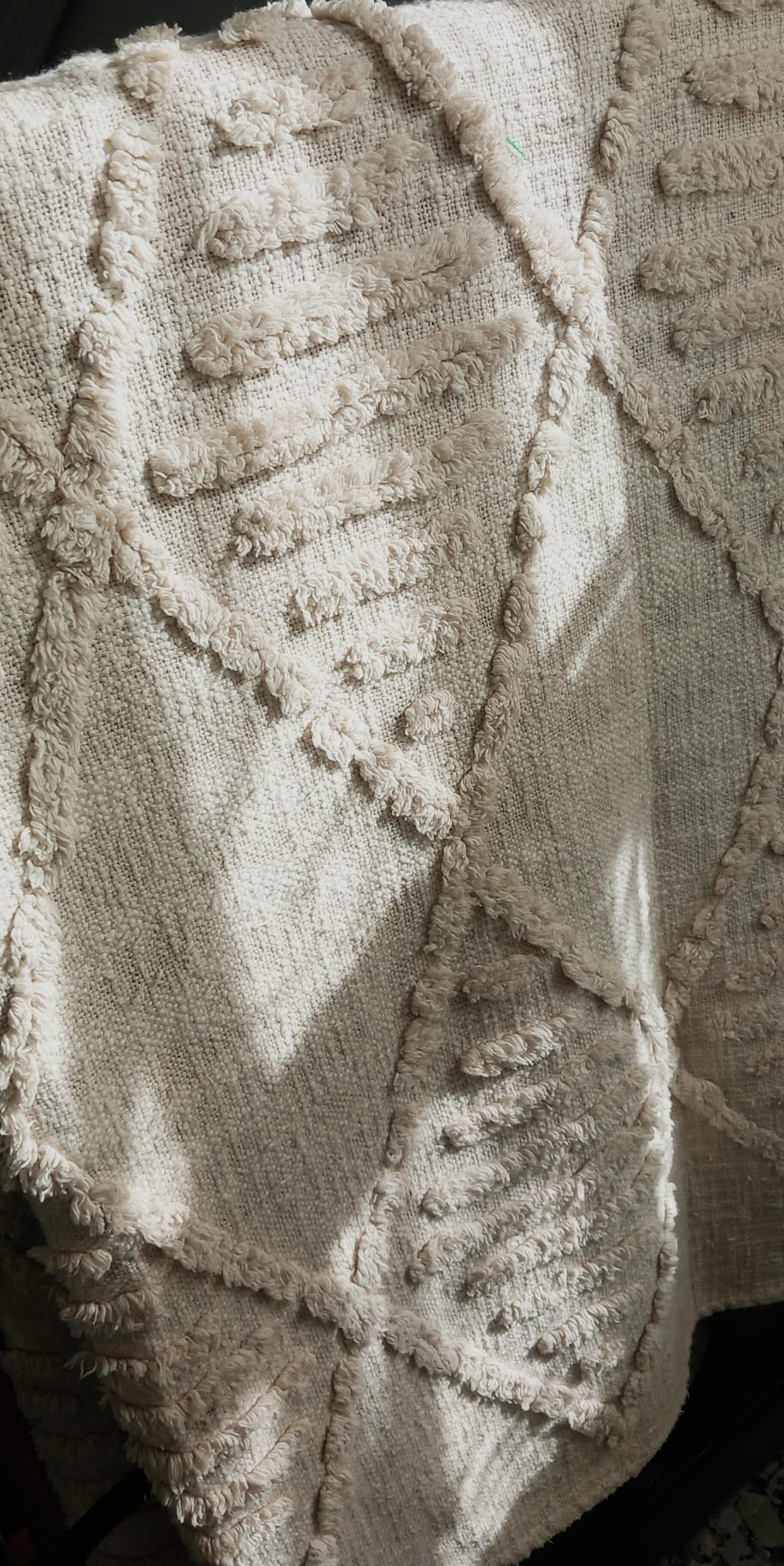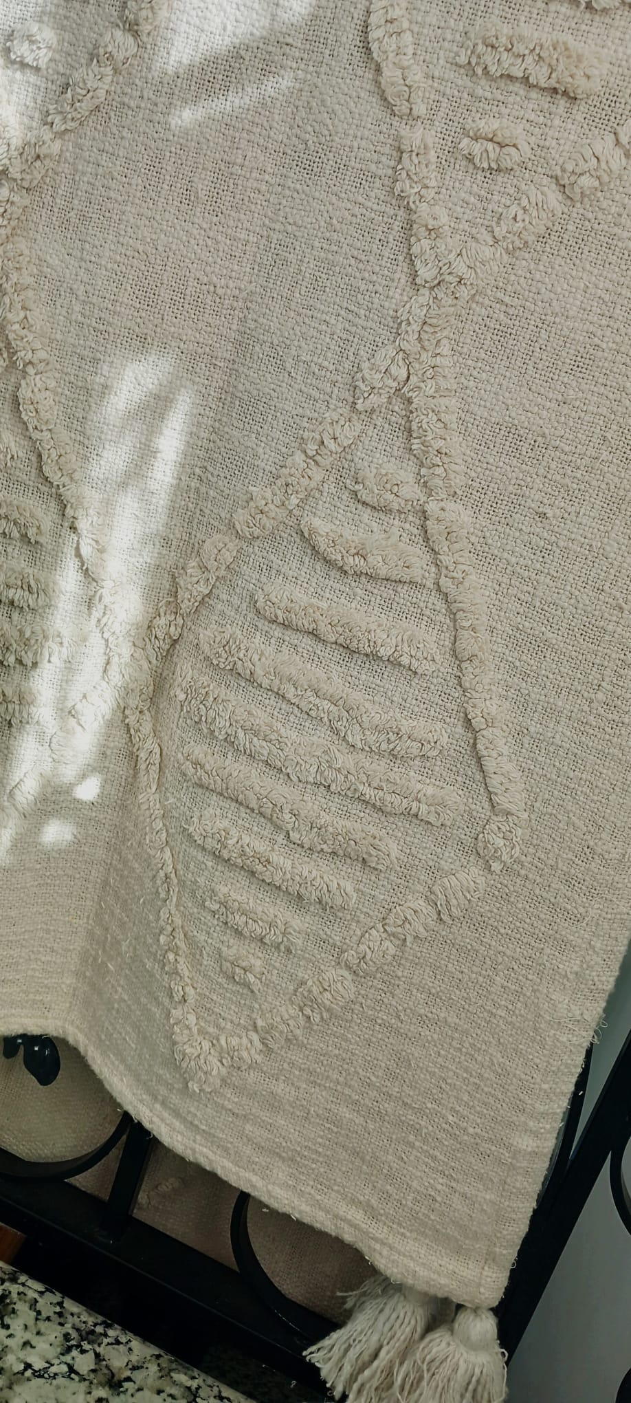 Jarapa Plaid elaborada de algodón. Tiene forma rectangular con detalle de borla en las esquinas.Por toda su superficie tiene un bonito dibujo geométrico en relieve del mismo tejido.